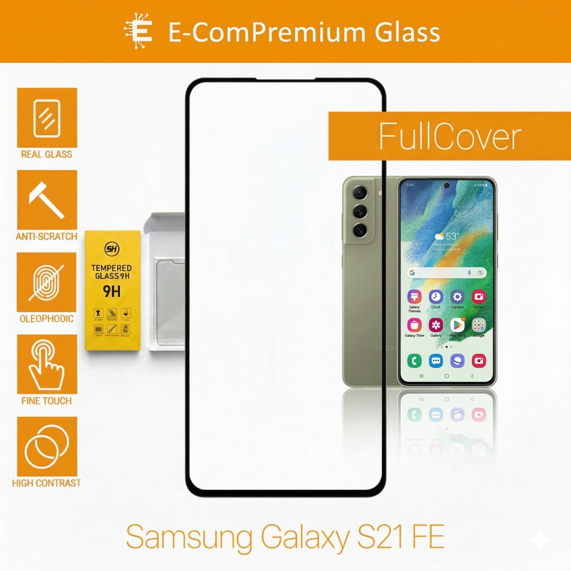 E-ComPremium Glass – Tvrdené sklo pre Samsung Galaxy S21 FE ponúka 360° ochranu s pokrytím od okraja po okraj, čím zaisťuje ochranu obrazovky a okrajov pred poškriabaním a nárazmi. Vychutnajte si ultračistú priehľadnosť HD a jednoduchú inštaláciu bez bublín, ktorá zachováva kvalitu obrazovky.