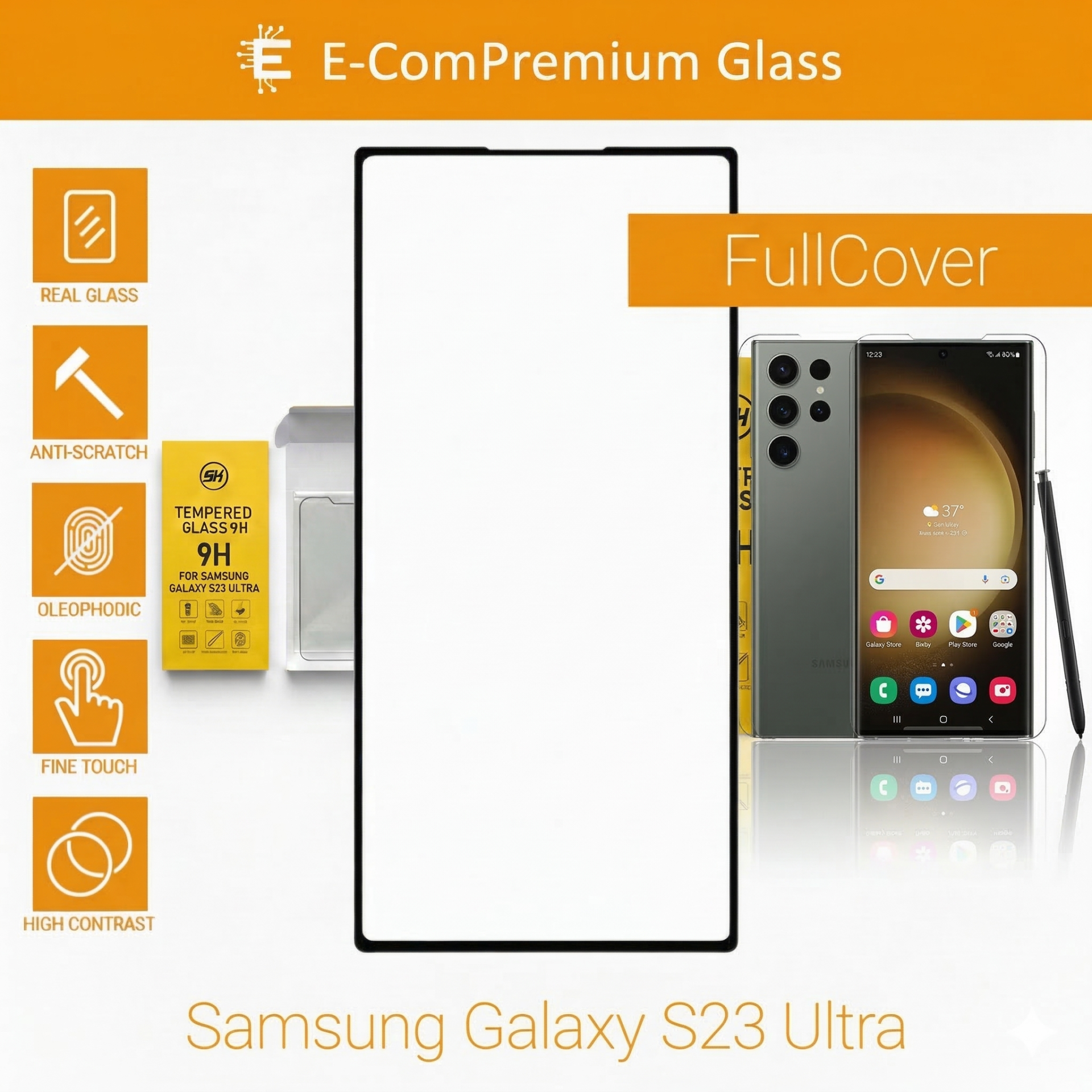 E-ComPremium Glass – Tvrdené sklo pre Samsung Galaxy S23 Ultra ponúka 360° ochranu s pokrytím od okraja po okraj, čím zaisťuje ochranu obrazovky a okrajov pred poškriabaním a nárazmi. Vychutnajte si ultračistú priehľadnosť HD a jednoduchú inštaláciu bez bublín, ktorá zachováva kvalitu obrazovky.