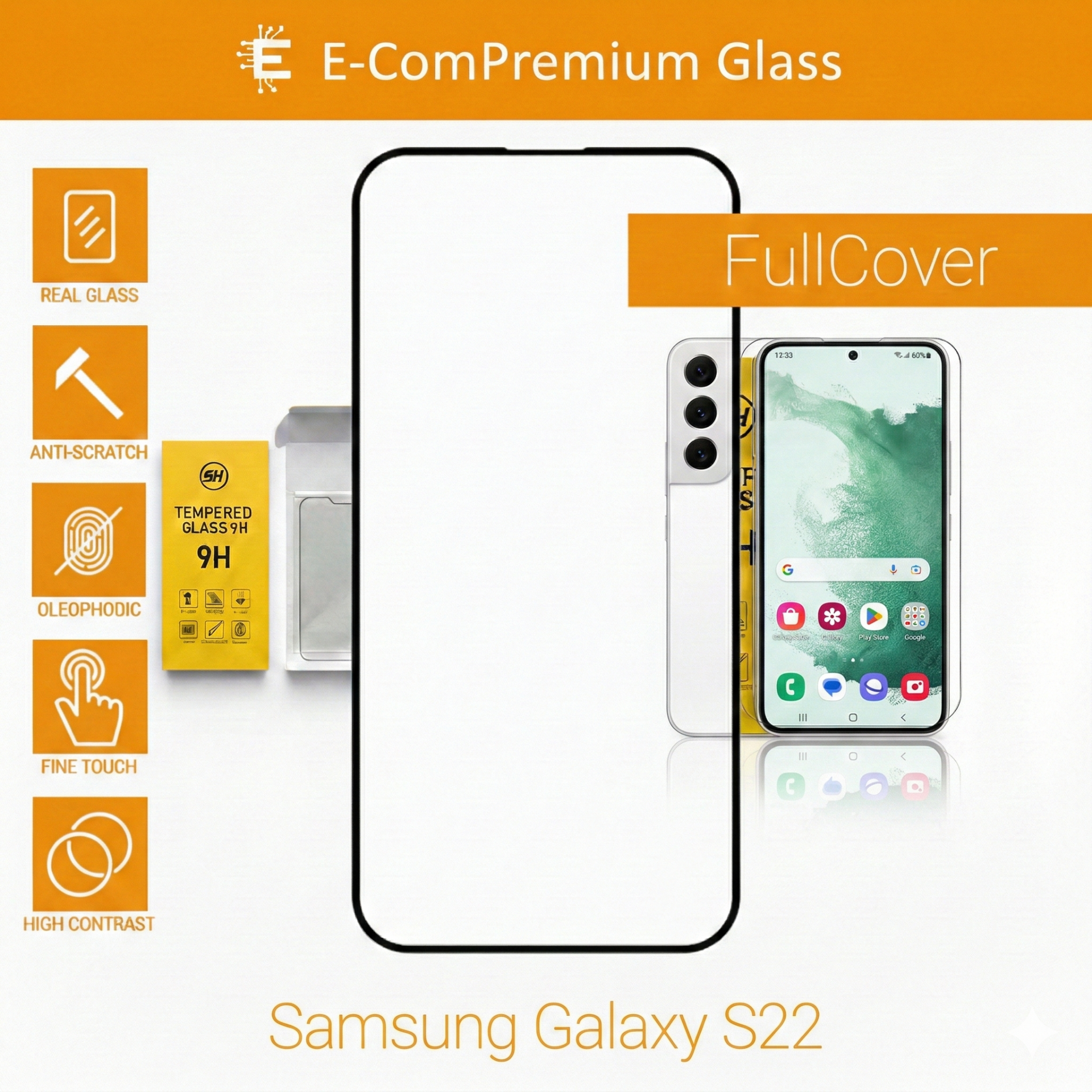 E-ComPremium Glass – Tvrdené sklo pre Samsung Galaxy S22 ponúka 360° ochranu s pokrytím od okraja po okraj, čím zaisťuje ochranu obrazovky a okrajov pred poškriabaním a nárazmi. Vychutnajte si ultračistú priehľadnosť HD a jednoduchú inštaláciu bez bublín, ktorá zachováva kvalitu obrazovky.